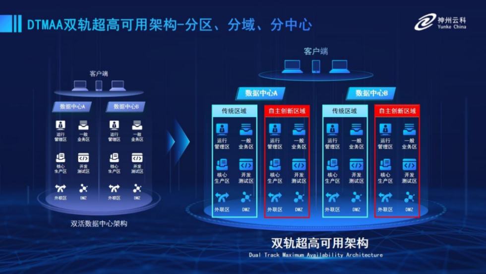为帮助金融客户更好地应对数字经济时代对可持续性的高要求,实现“信创”与“数字化”齐头并进,蓝狮娱乐 蓝狮推出了双轨超高可用架构。该架构在双活数据中心的分区调度基础上,增加信创域和非信创域的分域调度,实行信创域与传统域应用全量部署,使双中心运营变为双中心四区域并行运行,互为多活,将“0到1”的单轨建设道路变为分区分域协同的多活双轨超高可用架构。帮助客户在新架构下,保障“信创”的同时解决性能瓶颈,提升稳定性,保证应用可持续性,最终实现信创区域和非信创区域的平滑过渡,完成国产化替代目标。
